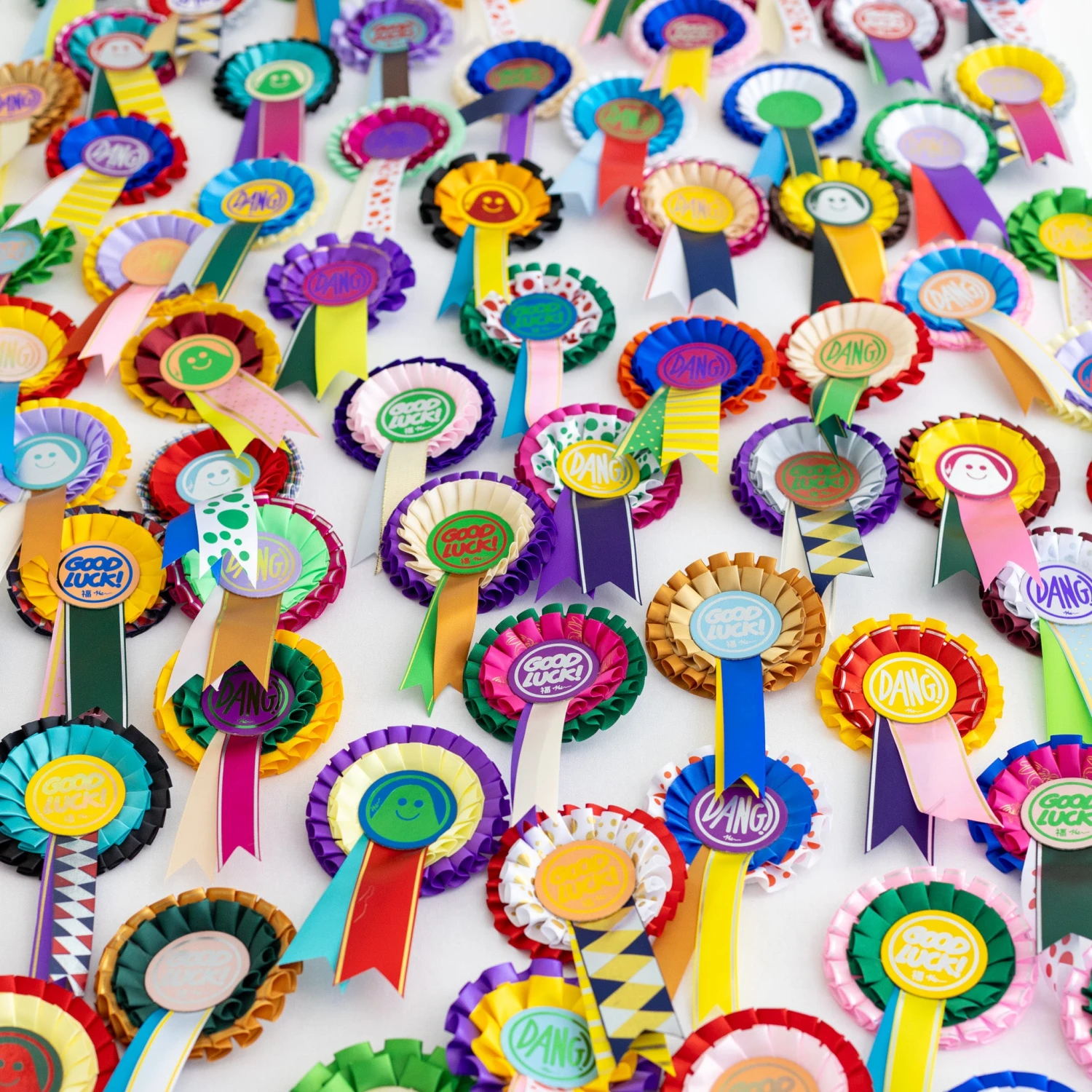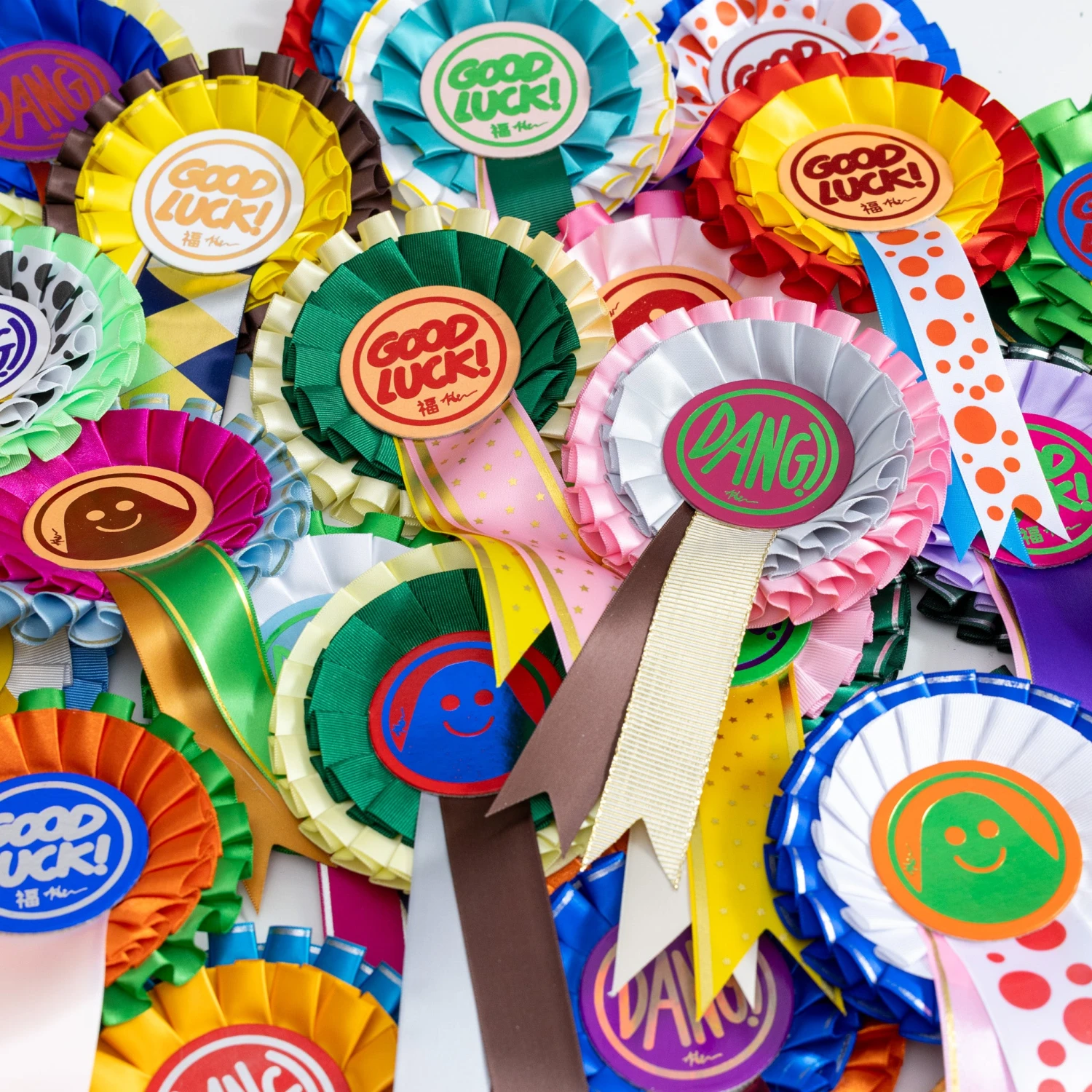 Please note: These badges are unique in ribbon / summary design. You will not get the exact badge you see pictured (but will get that specific motif – Dang, Good Luck or the Ghost).