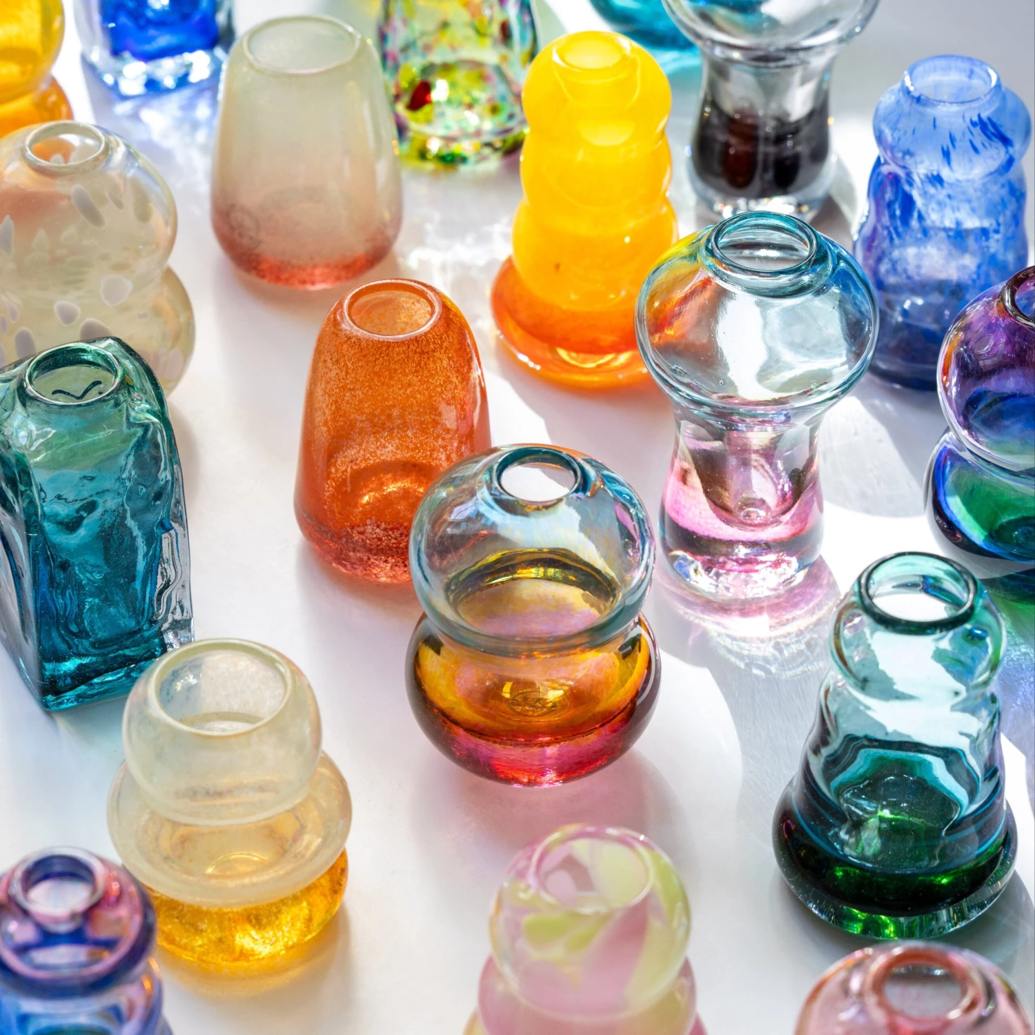 Each vase, made here at the studio, is first blown into form on an iron pipe and then opened and shaped using various tools – making each one unique.