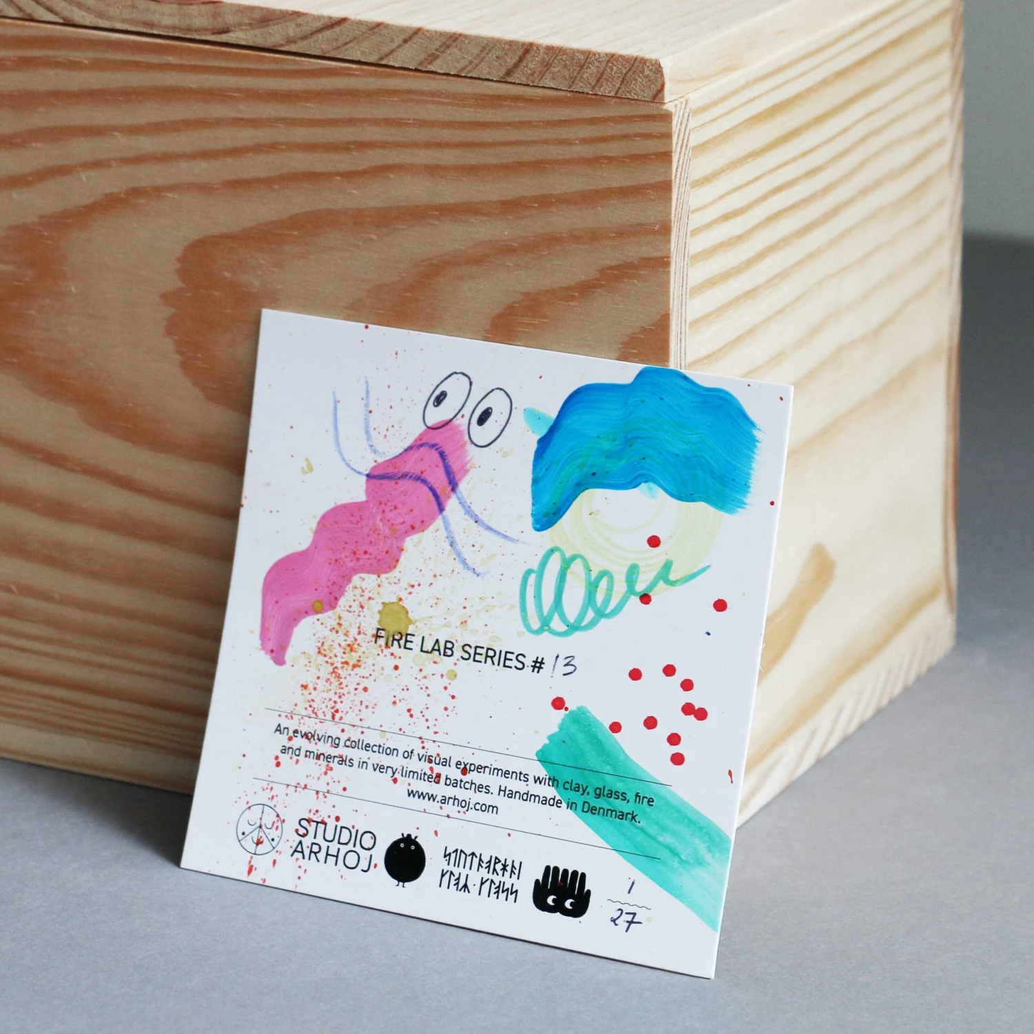Each Misfit was mouth-blown and individually decorated. No two were alike. They came in a protective wooden box along with a hand decorated numbered card.