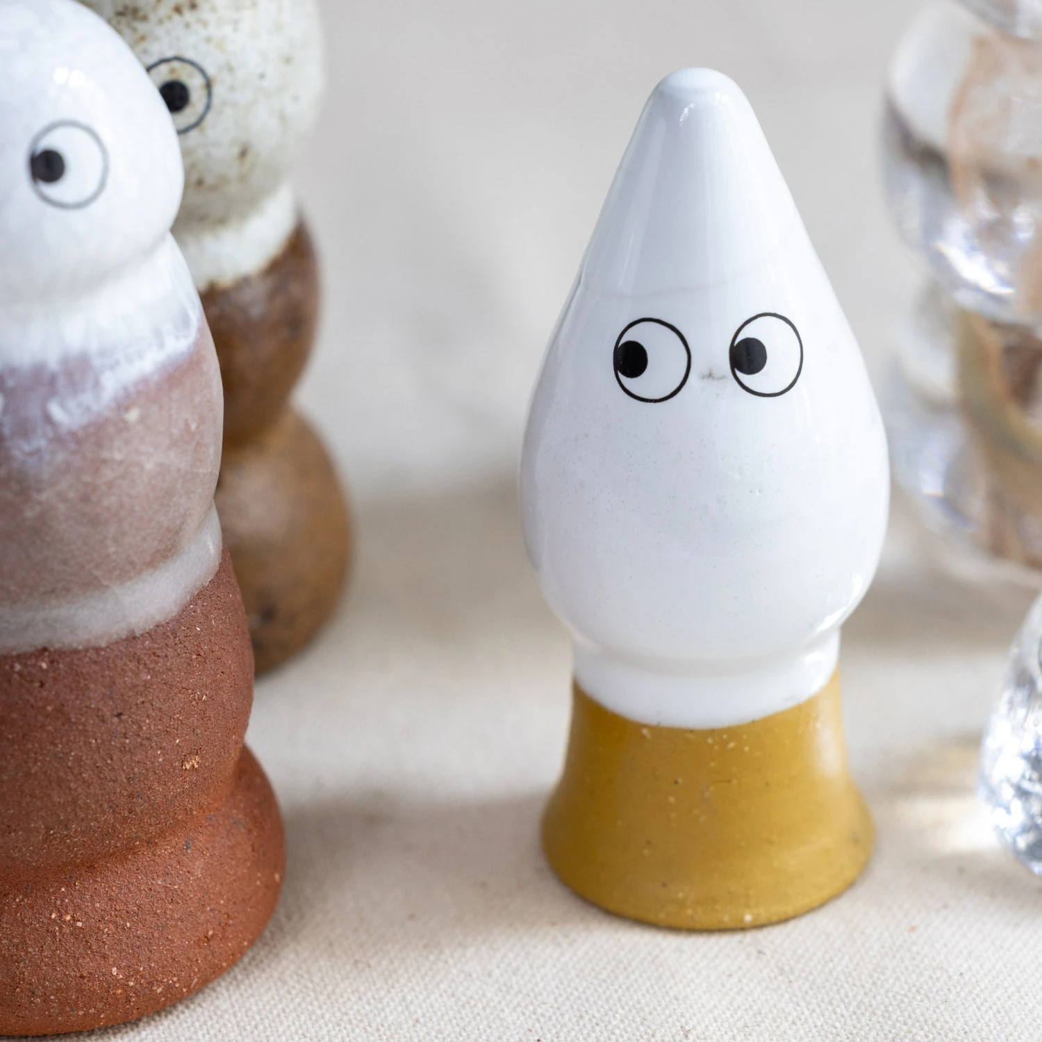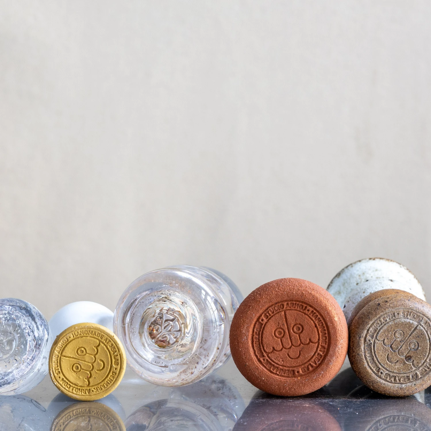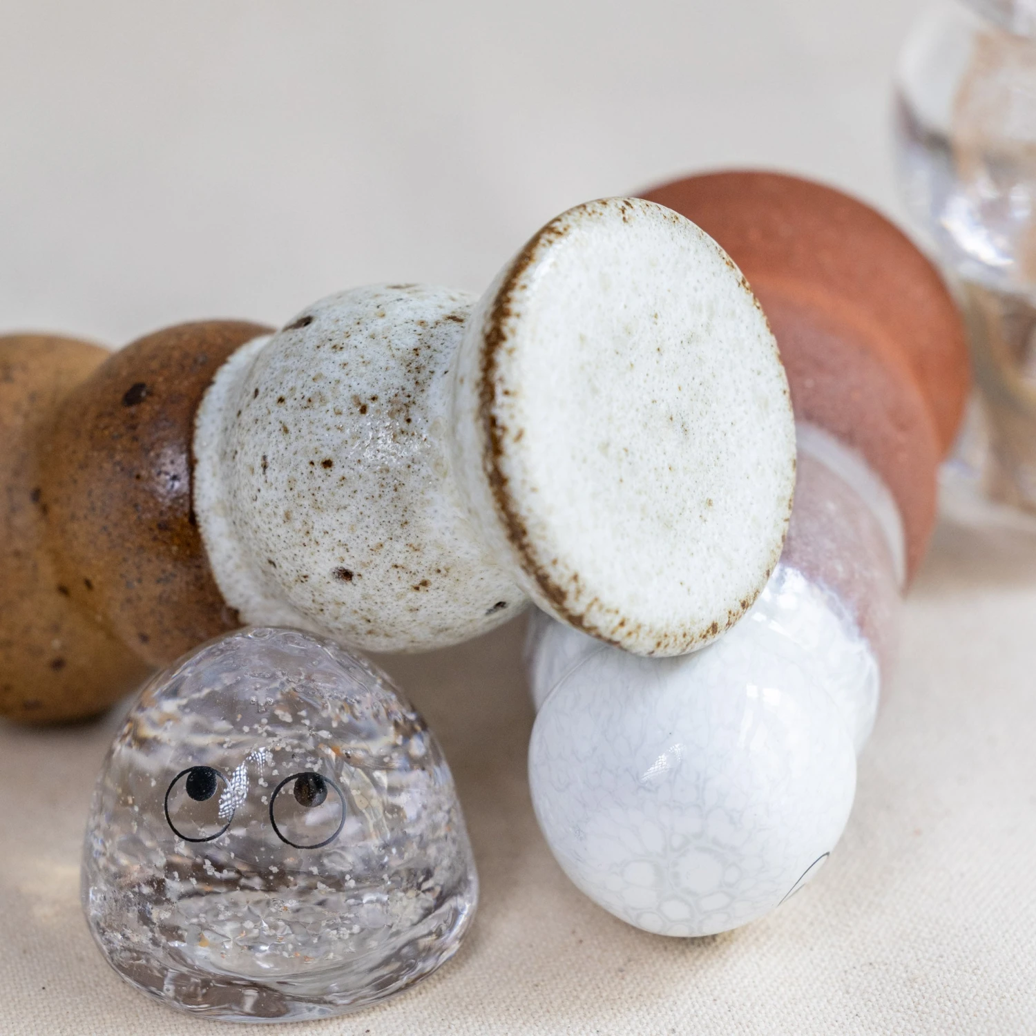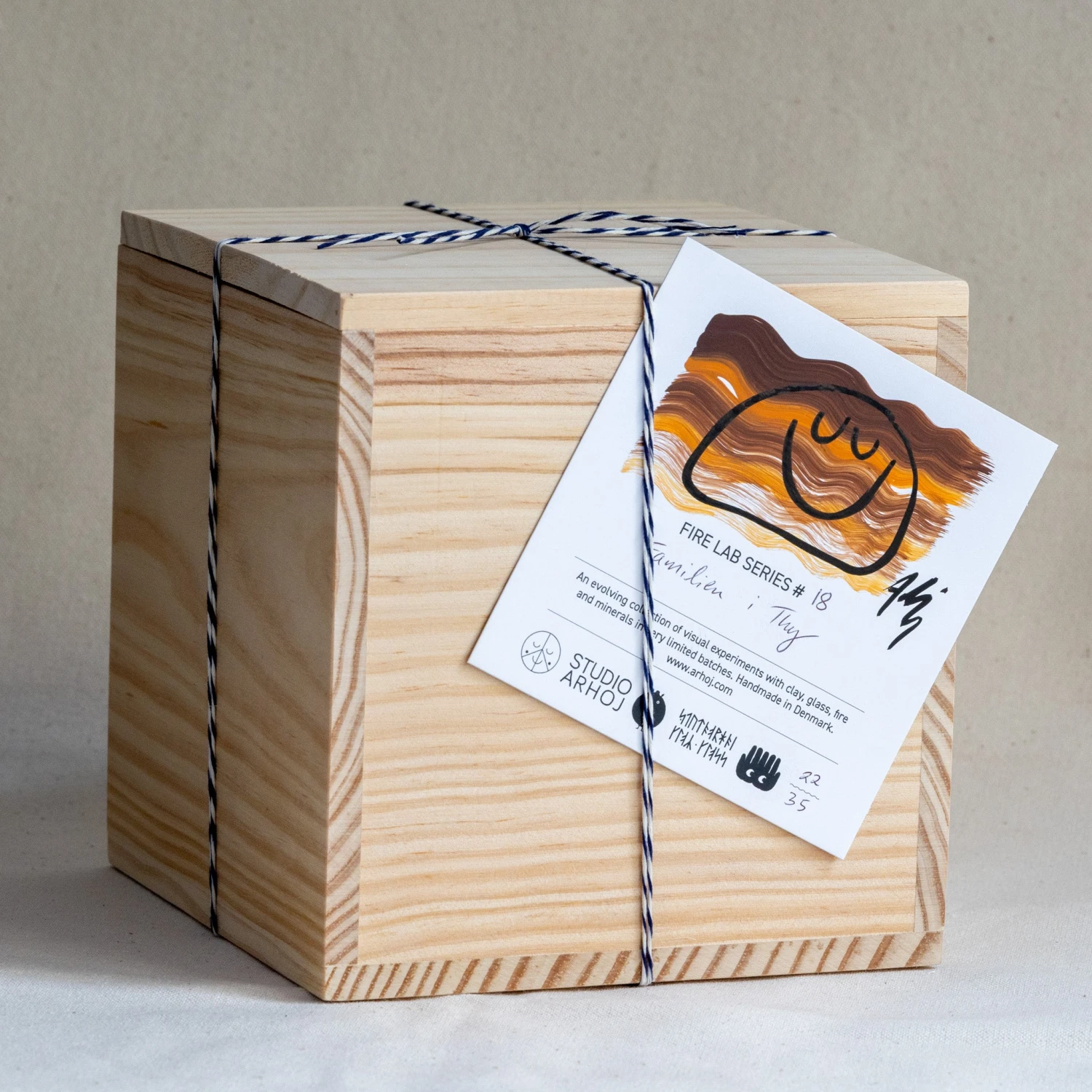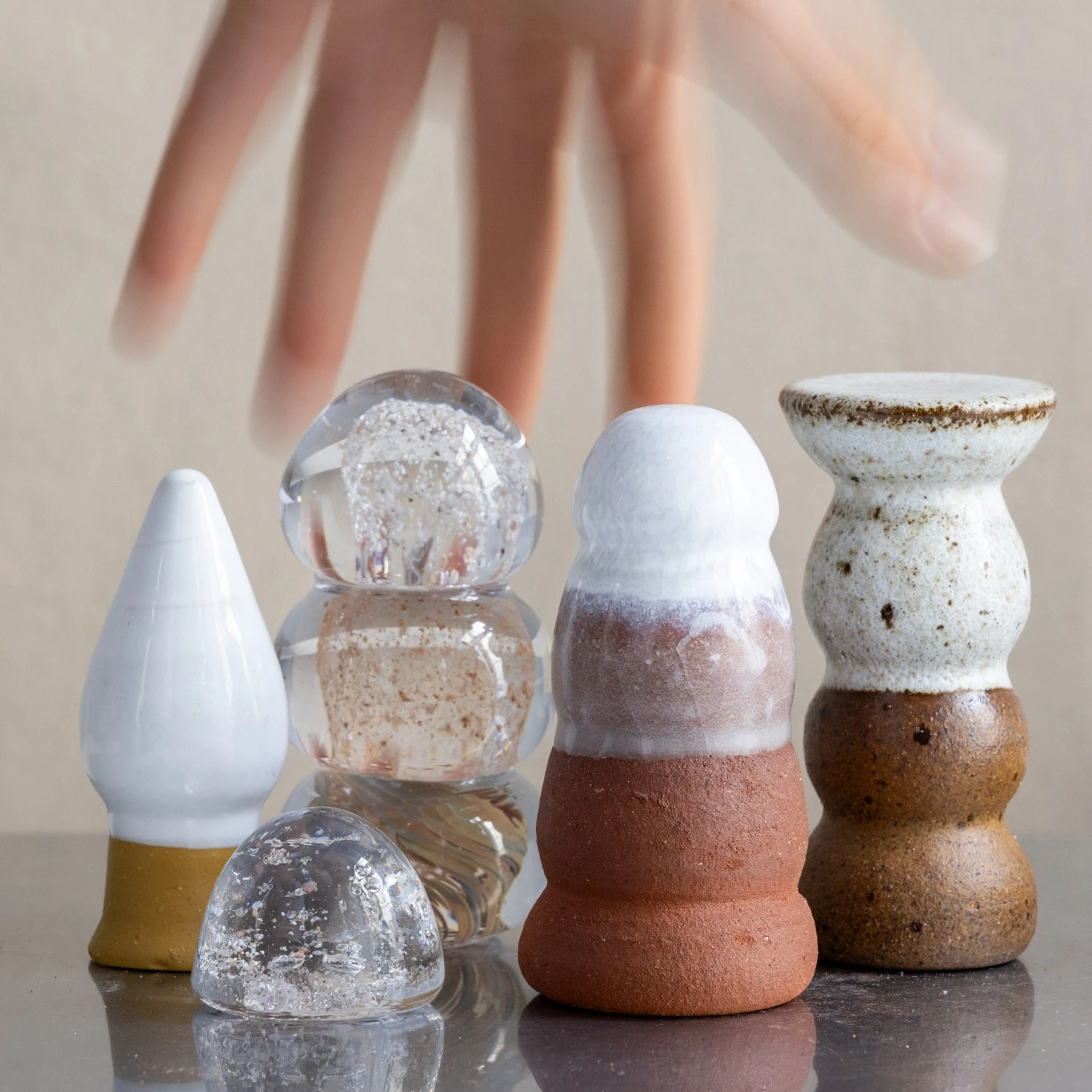 The 18th edition of our Fire Lab series, Familien i Thy, is quite a special one. Each set includes three unique hand thrown figurines made with clay from studio founder Anders’ parent’s beach. Along with the clay creatures the sets include a hand made Crystal Blob with clay and sand levitating inside and a sand cast glass Dot, also featuring materials from the beach.