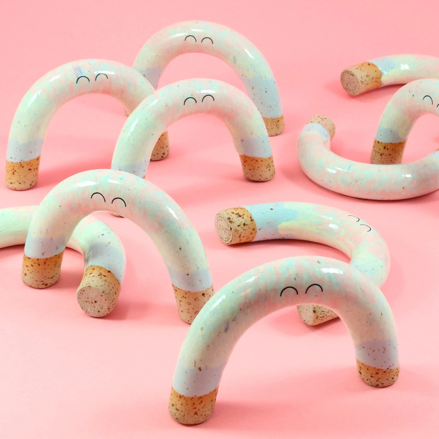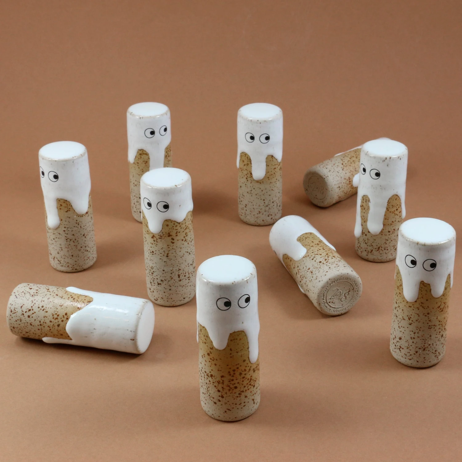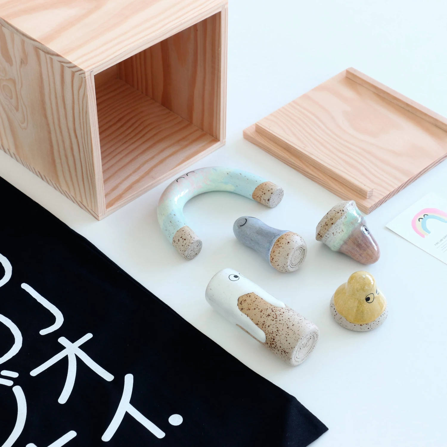 This limited collection of five Rainbow Family figurines was hand-thrown in speckled stoneware clay, glazed and stamped with our 2018 logo stamp. Housed in a custom Japanese inspired wooden box the little family came with a black tote bag and a signed, numbered and hand-painted documentation card.