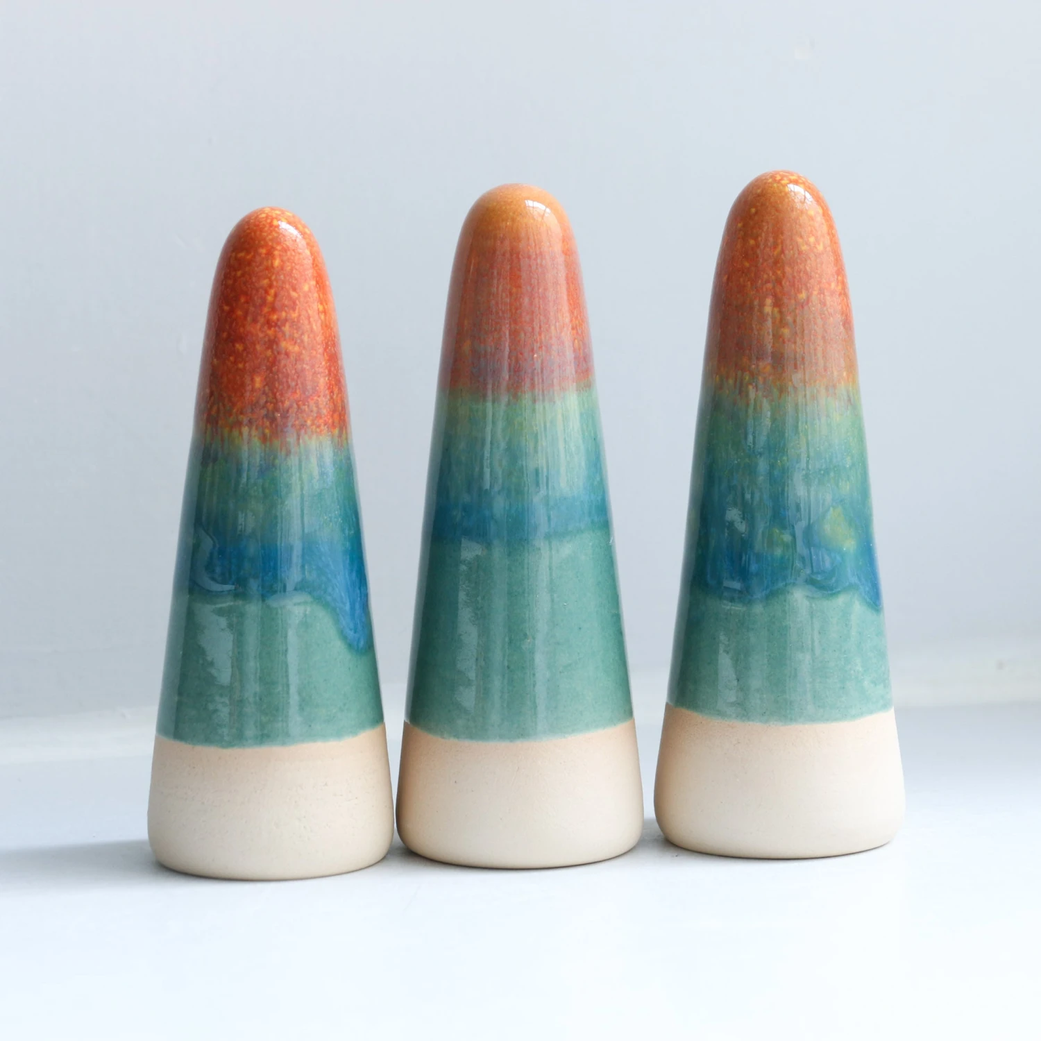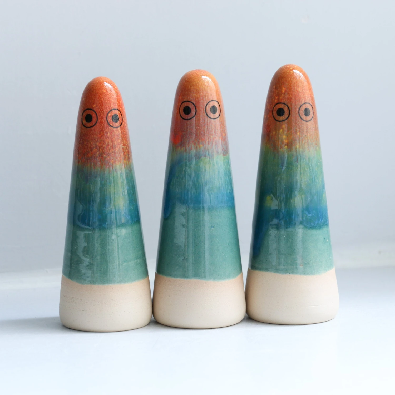 Ghosts quietly inhabit your living space and are useful as lucky talismans, ring holders or decorative objects. Each Ghost is unique, hand thrown, glazed, decorated and low-fired in the kiln three times.