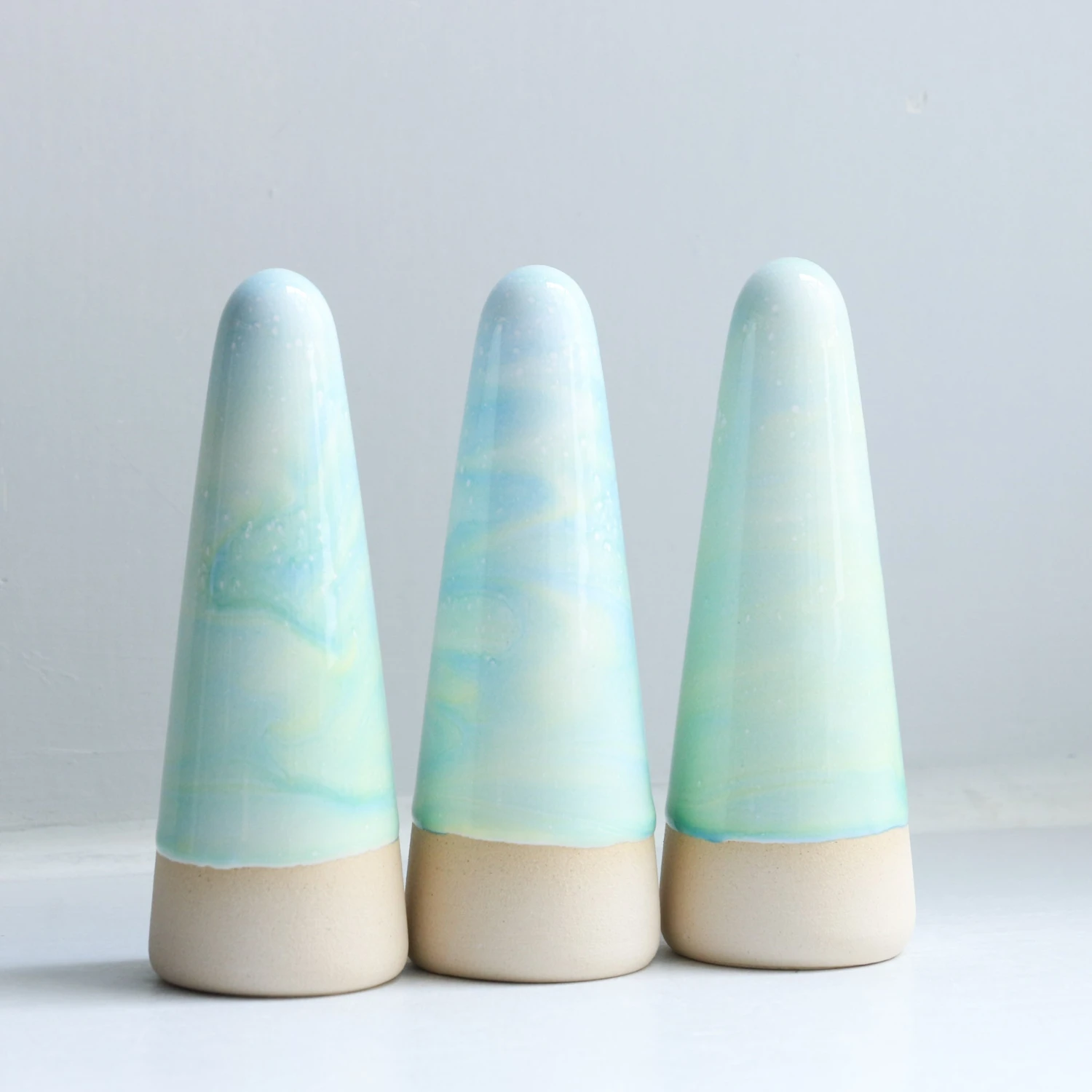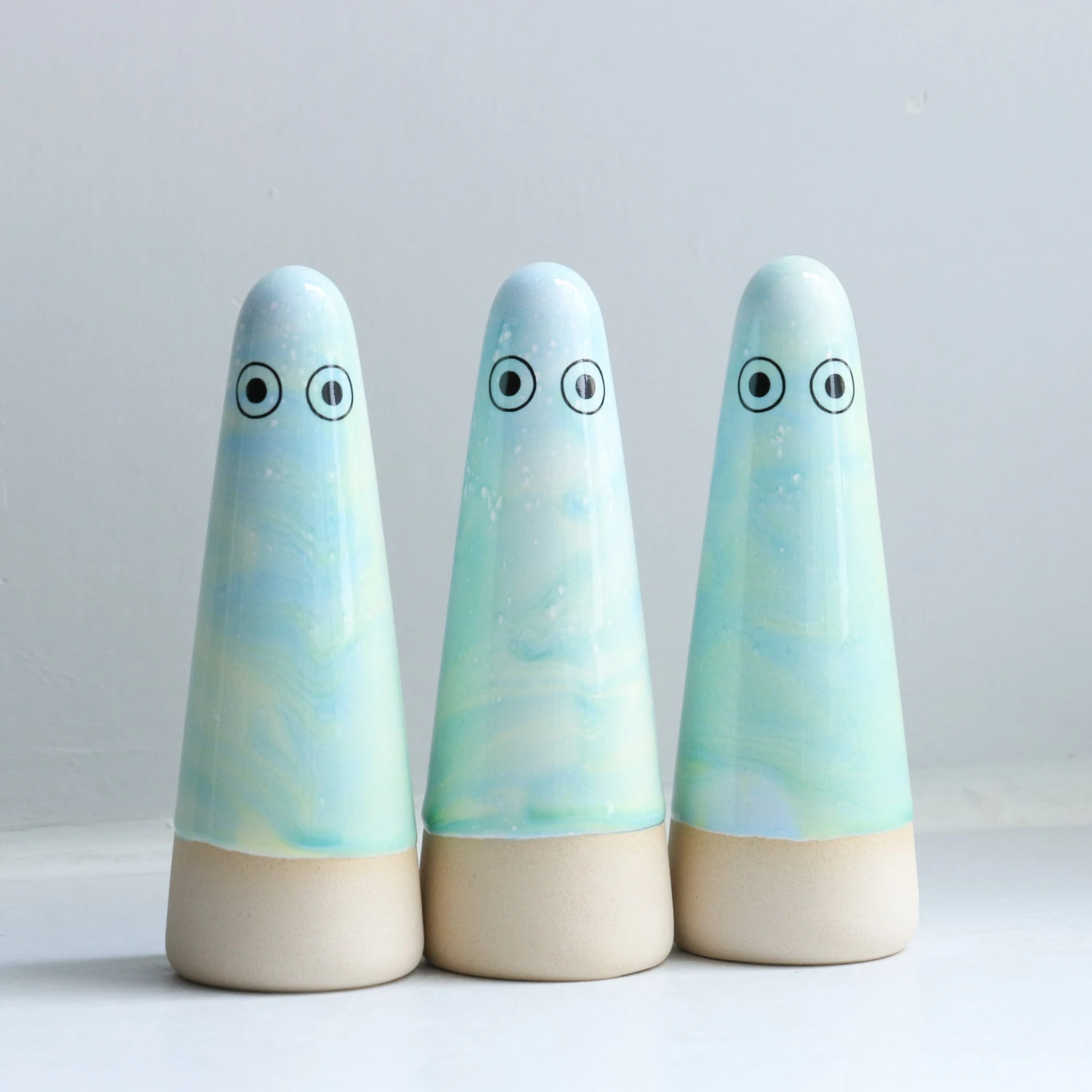 Ghosts quietly inhabit your living space and are useful as lucky talismans, ring holders or decorative objects. Each Ghost is unique, hand thrown, glazed, decorated and low-fired in the kiln three times.