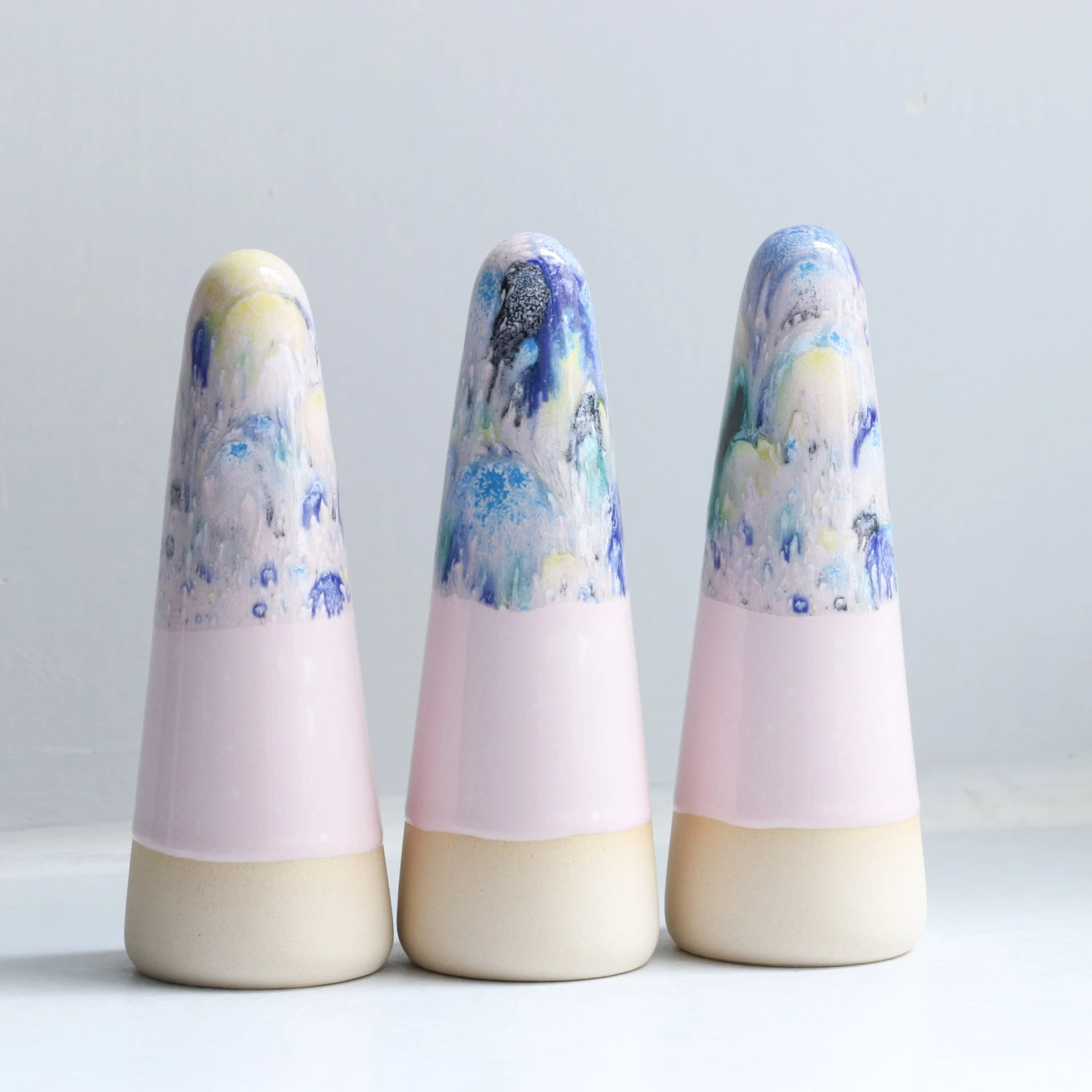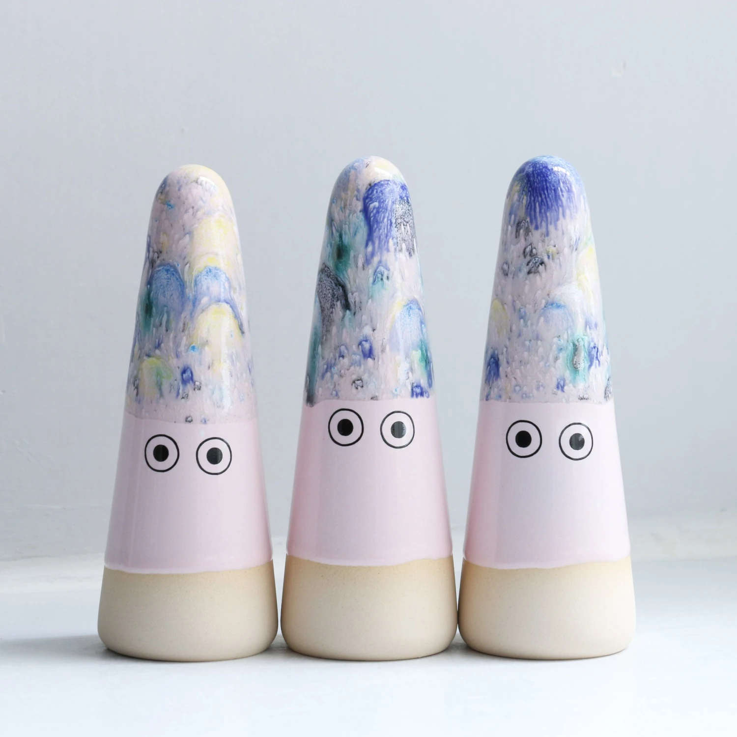 Ghosts quietly inhabit your living space and are useful as lucky talismans, ring holders or decorative objects. Each Ghost is unique, hand thrown, glazed, decorated and low-fired in the kiln three times.