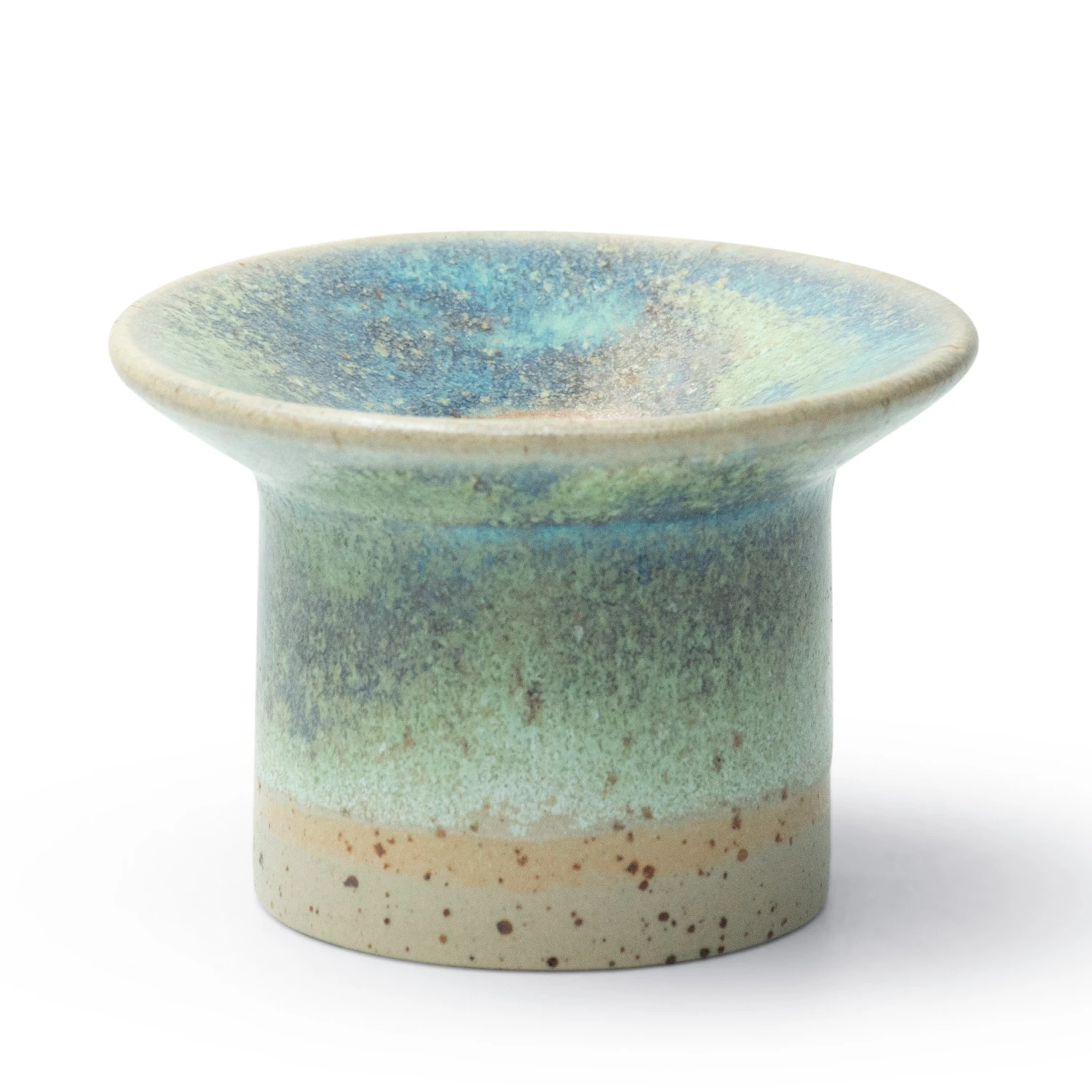 The slight bend allows our glazes to gently slide down the top during firing, creating a beautiful ring effect. The heavy foot keeps your candle safe and sturdy. As with our other handmade items, no two are ever completely alike.