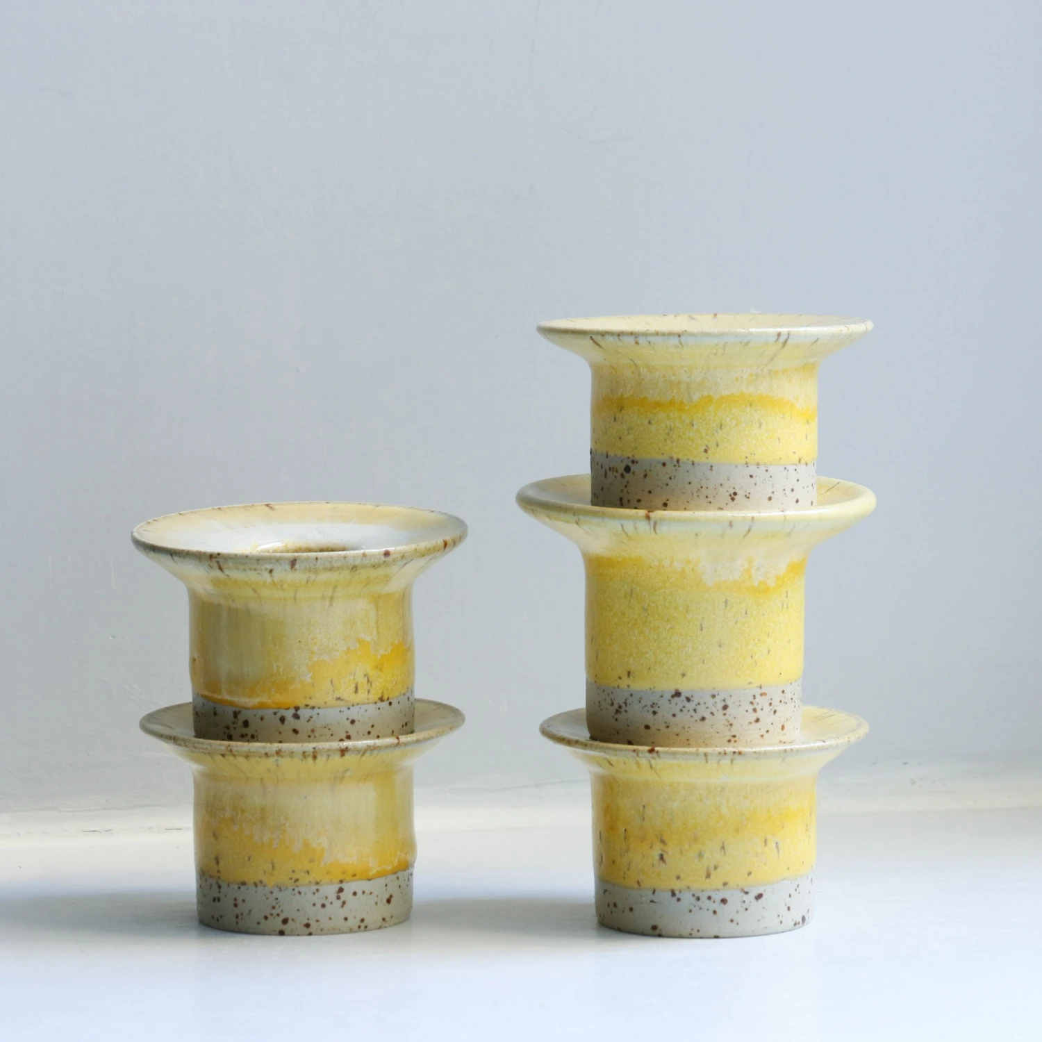 The slight bend allows our glazes to gently slide down the top during firing, creating a beautiful ring effect. The heavy foot keeps your candle safe and sturdy. As with our other handmade items, no two are ever completely alike.