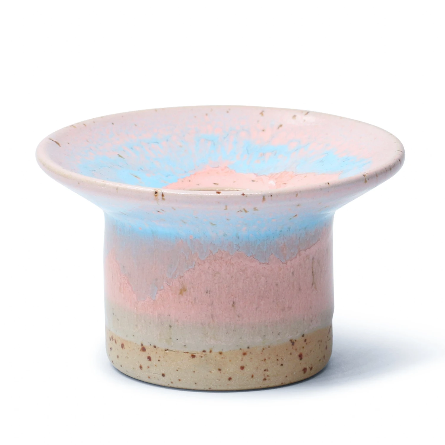 The slight bend allows our glazes to gently slide down the top during firing, creating a beautiful ring effect. The heavy foot keeps your candle safe and sturdy. As with our other handmade items, no two are ever completely alike.