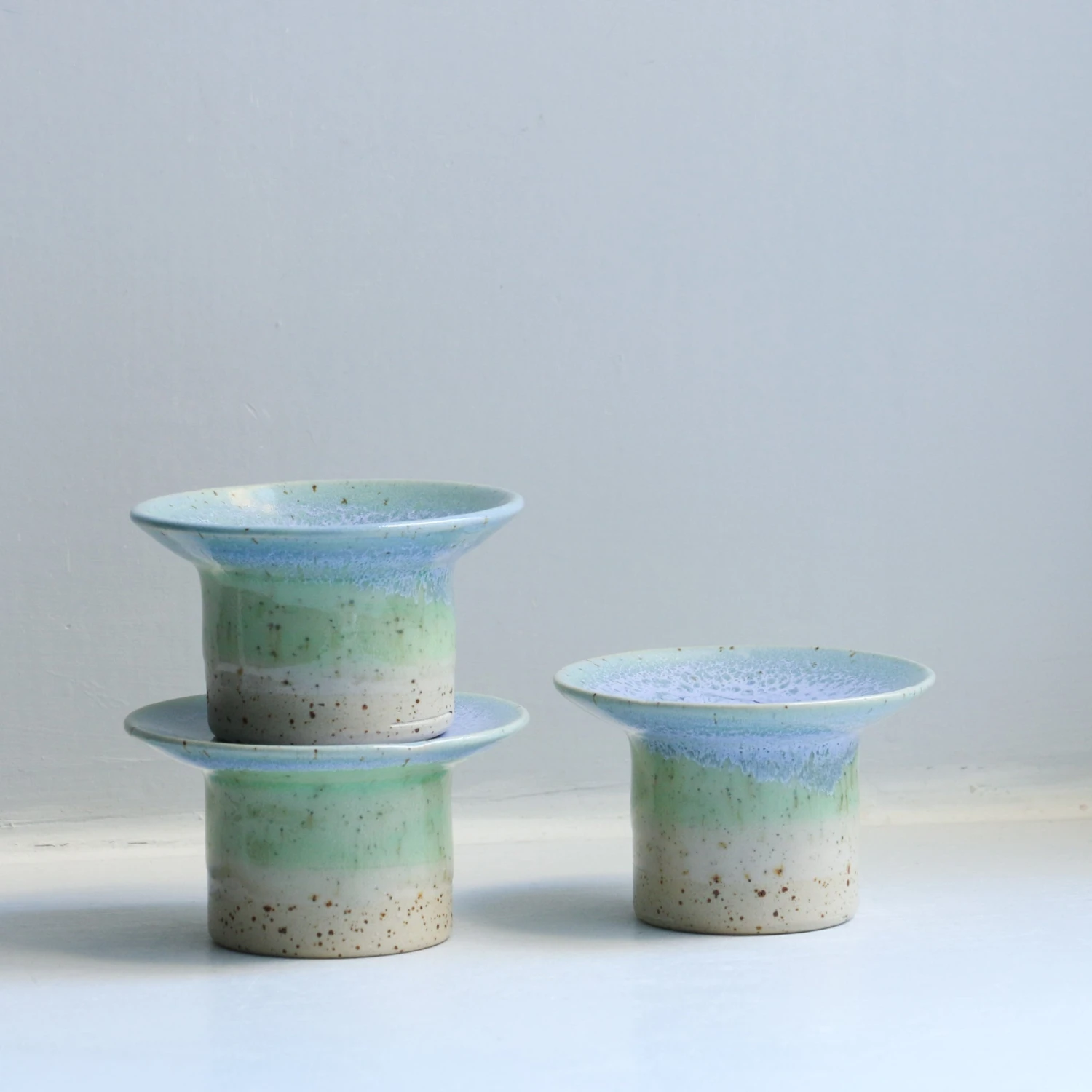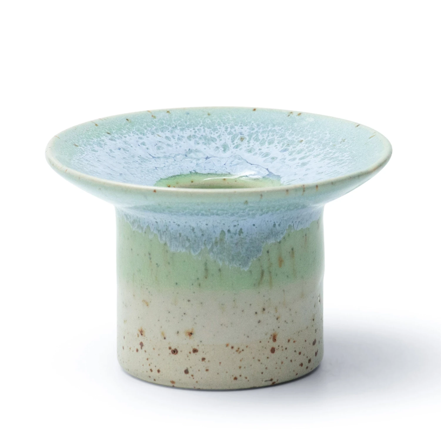 The slight bend allows our glazes to gently slide down the top during firing, creating a beautiful ring effect. The heavy foot keeps your candle safe and sturdy. As with our other handmade items, no two are ever completely alike.