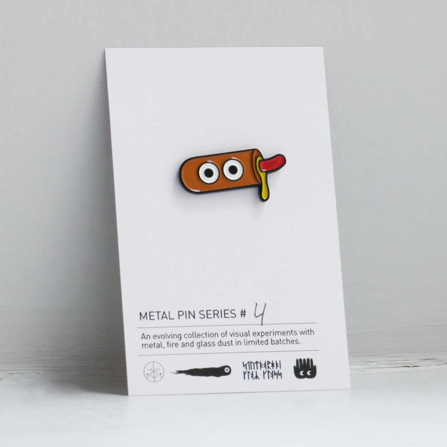 Metal Pin Series #4 is a large collection of 9 pins. The set includes some fun characters and some Danish staples like the french hotdog, our own studio dog Hanx, the Daisy and a shady black cat.