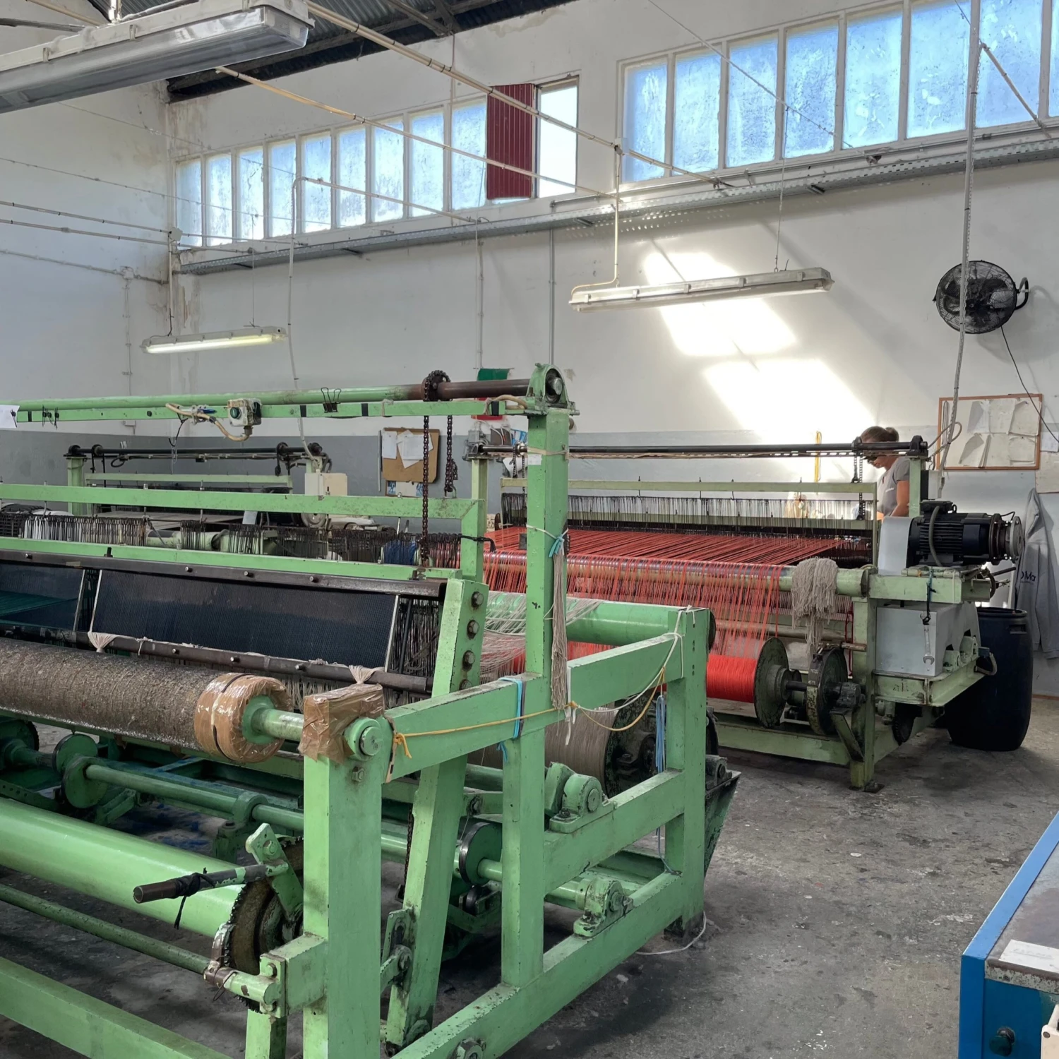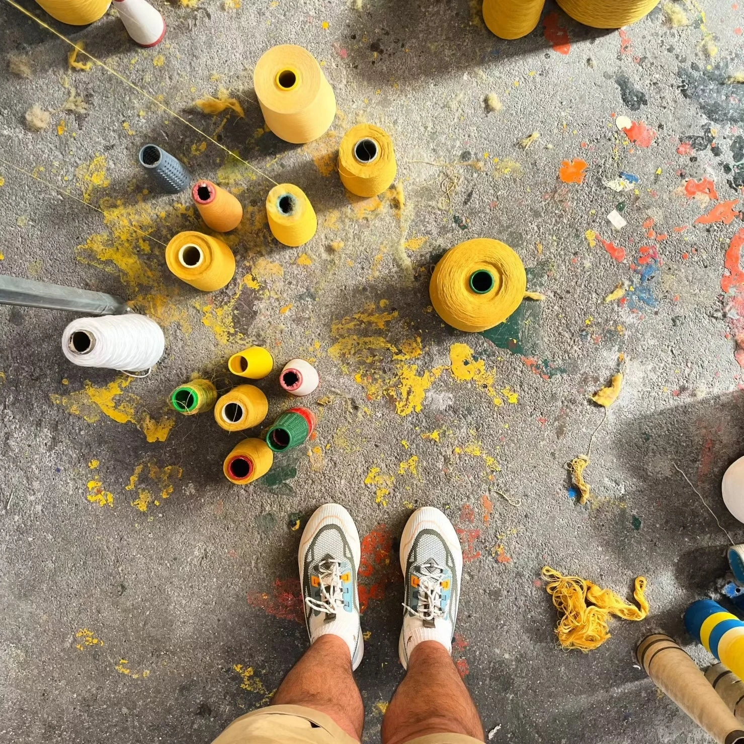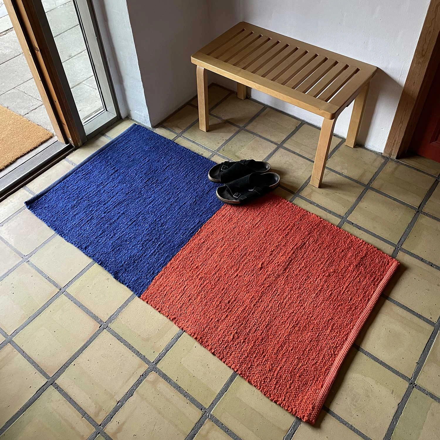 Designed in Denmark and handwoven in Portugal these rugs are produced using cotton fashion industry waste thread and natural jute. The rescued thread is batch dyed for more consistent color then spun together to create a twisty and knotted yarn of sorts, which is then woven into the rug by hand on a large mechanical loom.