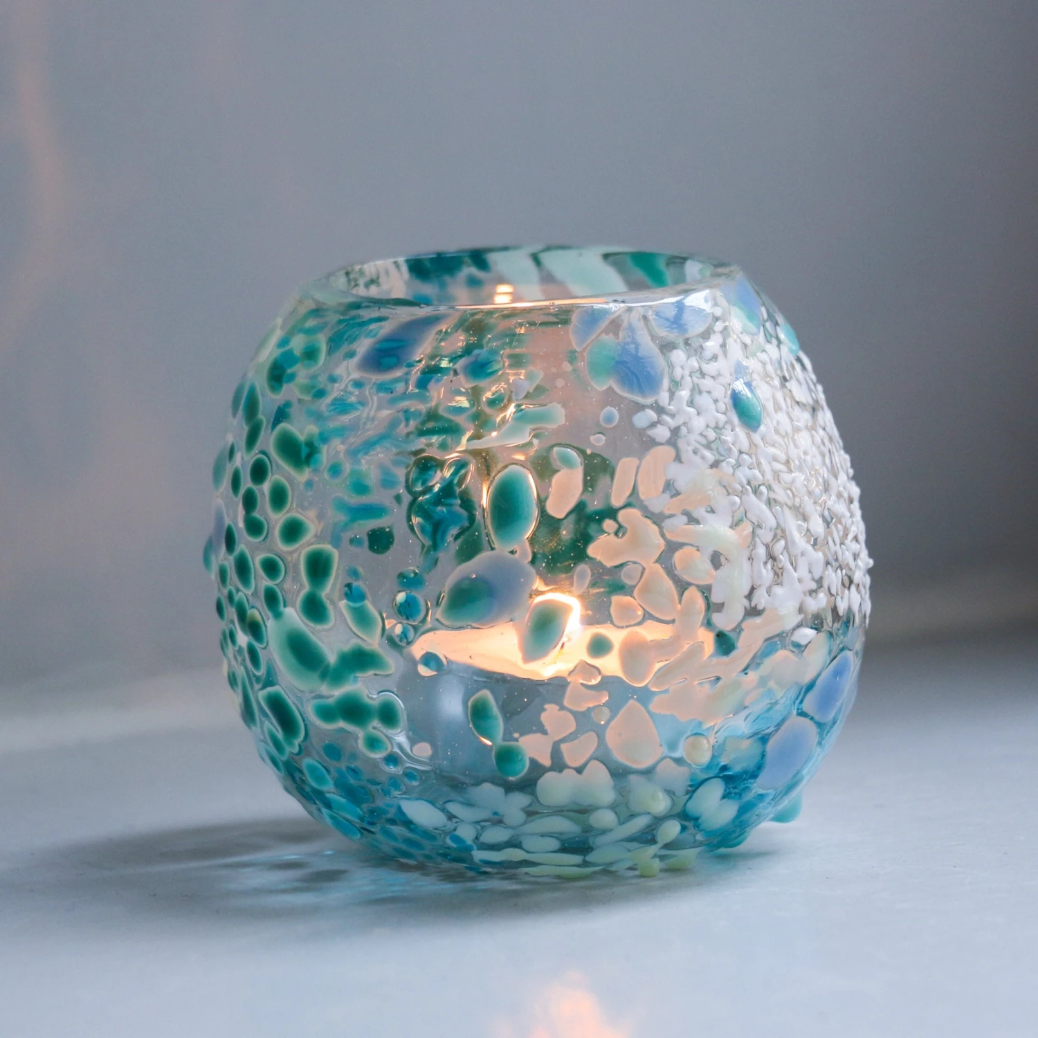 Each tea light holder will glow and cast shadows differently, according to the unique elements of the glass.